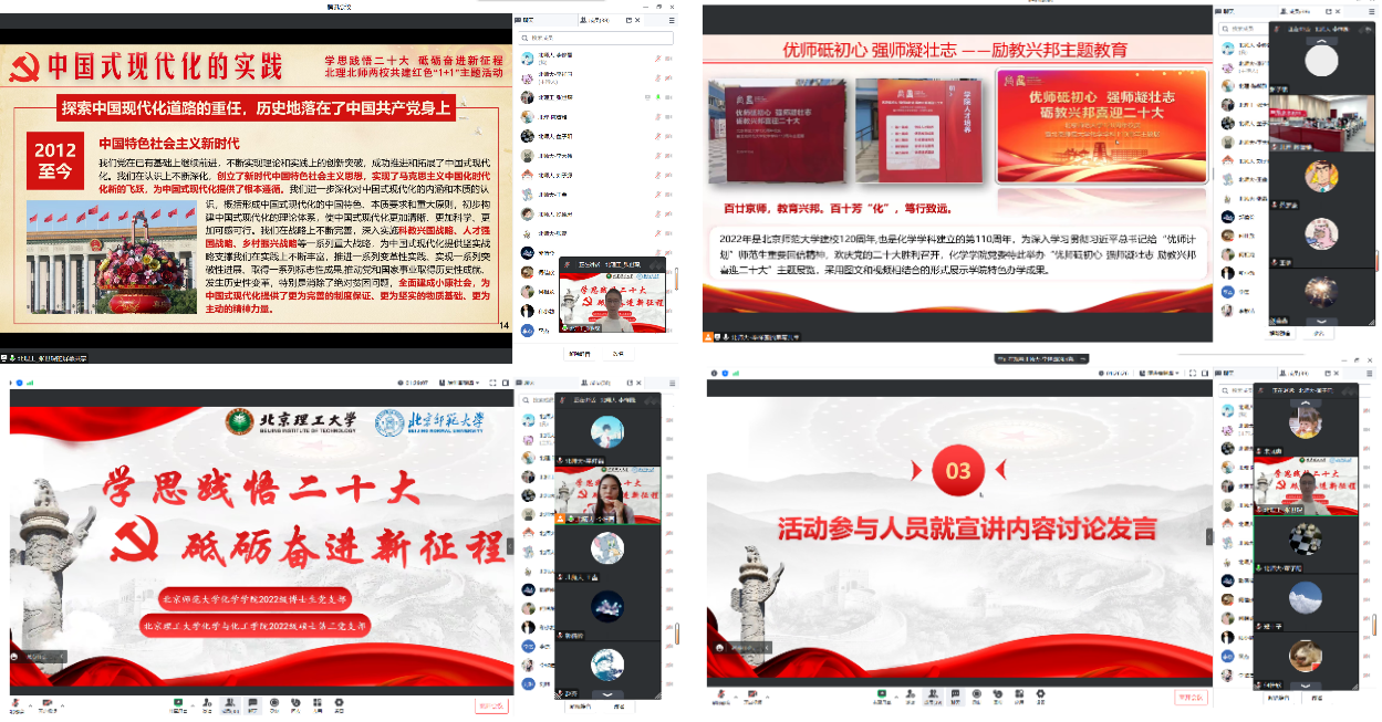 6月12日下午,两支部开展线上宣讲活动,北京理工大学化学与化工bet365体育 2022级硕三支部的支部书记张世琛介绍了北京理工大学化学与化工bet365体育 的党建工作基本情况并做《中国式现代化的理论精髓——深入学习党的二十大精神》主题党课宣讲;2022级博士生党支部书记李祥园介绍了本支部的党建工作基本情况并做《优师砥初心 强师凝壮志——励教兴邦主题教育》主题党课宣讲。听完两位支部书记的精彩党课内容后,两支部成员对所学所感进行了深入的发言和讨论,纷纷表示以实际行动践行党的二十大精神,努力做到以学铸魂、以学增智、以学正风、以学促干,展现当代青年学生党员的责任与担当。