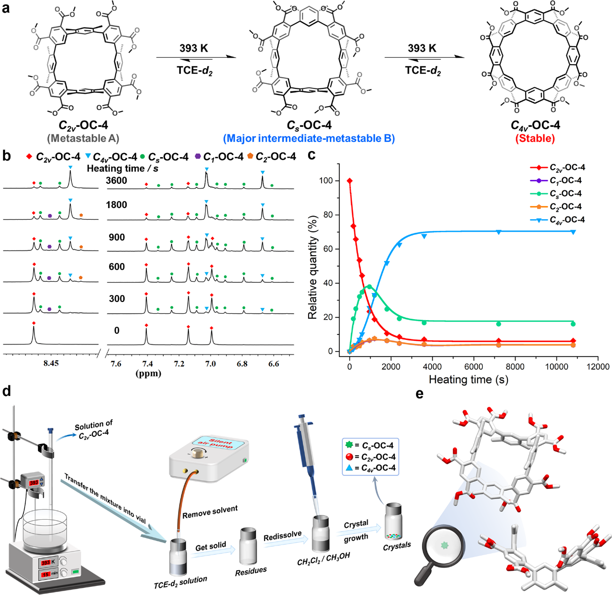 在TCE-d2溶液中进行C2v-OC-4的热转化过程中,除C2v-OC-4和C4v-OC-4信号外,三套新出现的信号表明该转化过程为活性中间体参与的历程。5种OC-4大环在TCE-d2溶液中达到平衡,表明该过程为可逆过程。而在toluene-d8溶液中进行C2v-OC-4的异构化过程时,C2v-OC-4可完全转化为C1-,Cs-,C2-和C4v-OC-4,表明该过程为不可逆过程。上述结论进一步通过直接加热C4v-OC-4的TCE-d2和toluene-d8溶液得到验证。对核磁信号分析及理论计算,三个中间体大环分别具有C1-,Cs-,C2- 对称性,即C1-OC-4,Cs-OC-4和C2-OC-4。此外,通过中间体的俘获,获得了中间体Cs-OC-4的单晶结构,并通过机械分离获得了少量Cs-OC-4的晶体纯品,从而对其进行了液相核磁表征。
