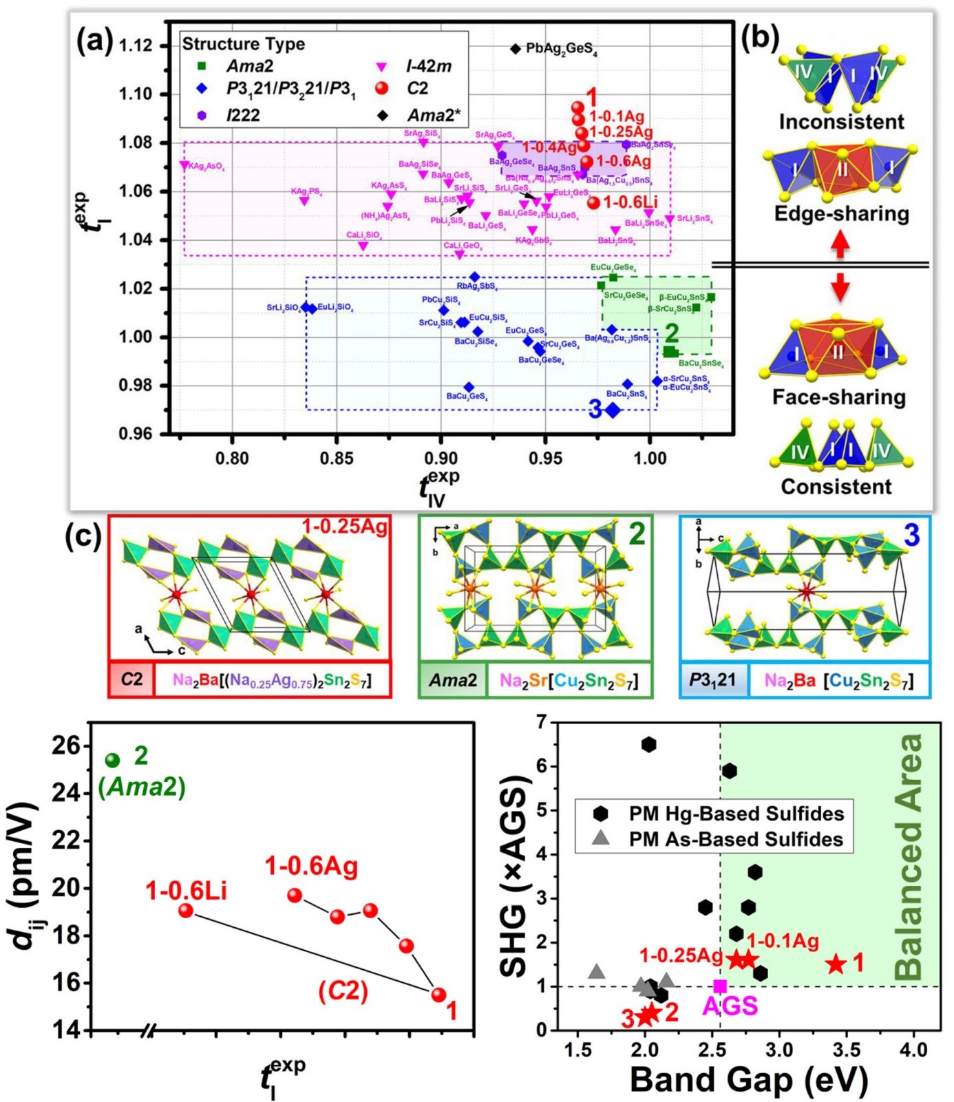 硫属化合物是一类重要的非线性光学晶体材料,是红外激光技术应用中的关键核心材料之一,虽然化合物众多,仍面临高性能材料匮乏的瓶颈。绿色安全材料的需求更是对无铅、无汞、无砷的无毒高性能红外硫属非线性材料的探索研究和开发提出了迫切的要求。然而,单一晶体结构的一些核心参数,例如能隙,二阶倍频系数,通常呈负相关关系,如何克服这个挑战,成为该领域的研究前沿和难点。