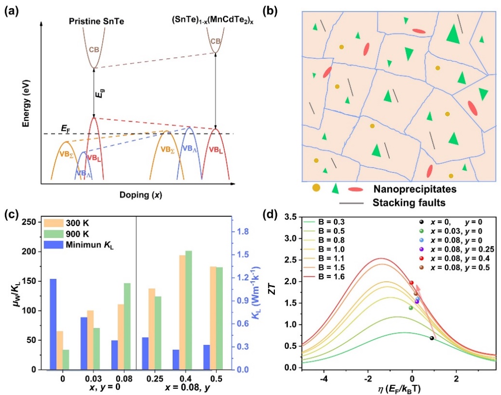 针对上述关键科学问题,北京师范大学吴立明教授和陈玲教授课题组选取具有双价带电输运特征的SnTe为研究对象,通过MnCdTe2合金化策略激活了SnTe低能量位置的价带,首次实现SnTe体系三价带协同的电输运;进一步通过合理的固溶度调控,细化了析出相尺寸,最终实现热输运与电输运的协同优化。