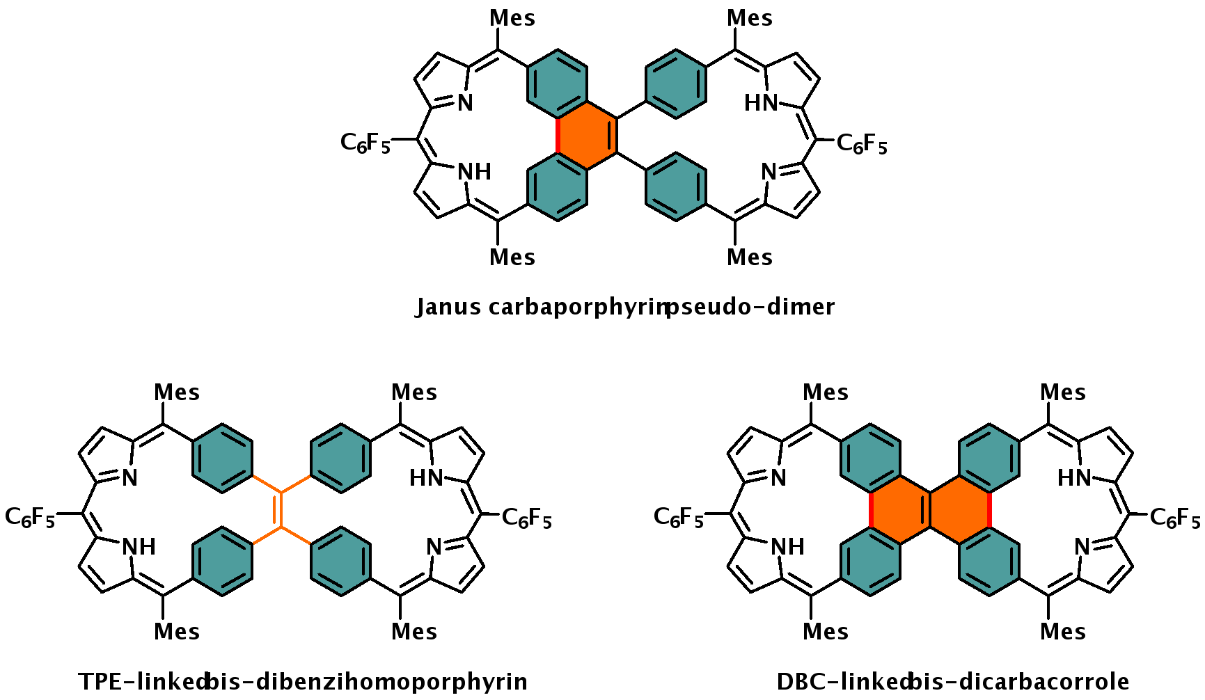 图1. Janus碳杂卟啉伪二聚体和对称碳杂卟啉二聚体的化学结构。