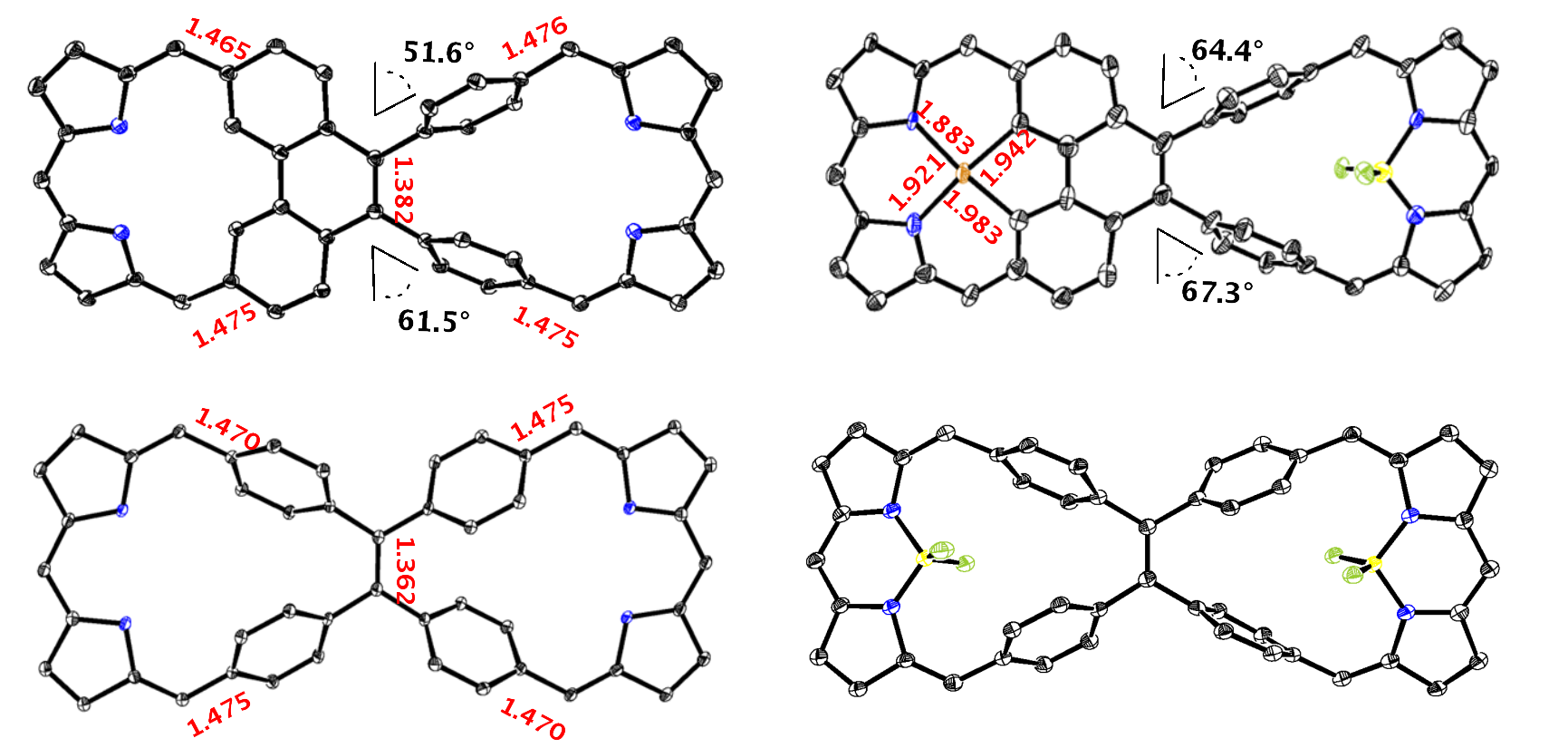 图3. Janus碳杂卟啉伪二聚体,双边未稠合的对称二聚体及其配合物的单晶结构。