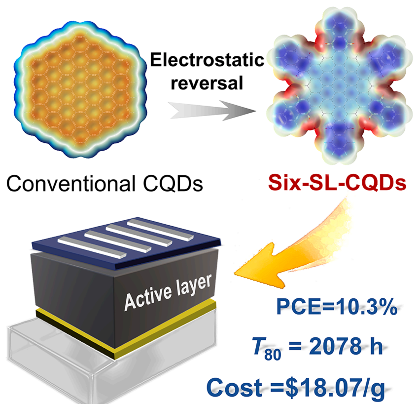 张洋、范楼珍老师团队通过材料结构设计,合成了一种具有六边形对称性的雪花状碳量子点(Six-SL-CQDs),制备成本仅为约18.07美元/克,仅为当前商用受体材料(如PCBM、ITIC和Y6)价格的五百分之一,显著降低了SCs器件活性层的材料成本。在Six-SL-CQDs的顶角引入吸电子官能团,有效诱导分子极化,实现了碳核与边缘位置静电势的反转分布,不仅显著增强了CQDs与给体分子之间的弱相互作用,同时促进了分子的有序堆叠,实现了高效的激子解离。基于Six-SL-CQDs作为活性层材料所制备的SCs器件,其最高PCE已经达到10.3%,并展现出优异的器件稳定性,在持续运行2078小时后仍能维持80%以上的初始性能。该项研究推进了环境友好、低成本、高光电转换效率的CQDs材料在光伏领域的实际应用。