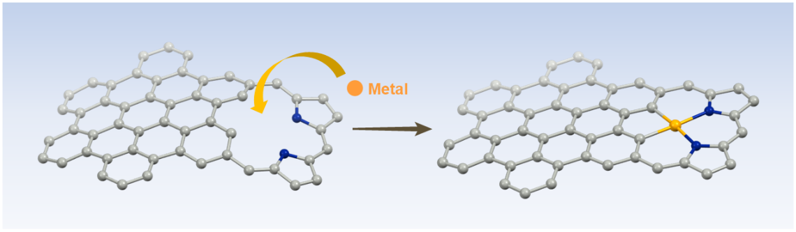 纳米石墨烯作为石墨烯的有限尺寸模型,在纳米电子学、光电子学和自旋电子学等领域有广泛的潜在应用。杂原子掺杂是调控纳米石墨烯电子结构的有效策略,目前通过自下而上的合成,已能精准制备含硼、氮、氧、硫、硒等杂原子的纳米石墨烯,并可控制分子尺寸、边缘结构、取代基及掺杂浓度与位置。相比于杂原子掺杂,纳米石墨烯的精准金属掺杂的概念还未被正式提出。虽然目前有基于金属-碳π或σ键的纳米石墨烯金属配合物、外围掺杂氮原子作为配位点的纳米石墨烯金属配合物、以及四吡咯金属卟啉-纳米石墨烯稠合体系的报道,但是仍然缺乏一个通用的纳米石墨烯配体平台,来实现在纳米石墨烯碳骨架上的直接金属掺杂。