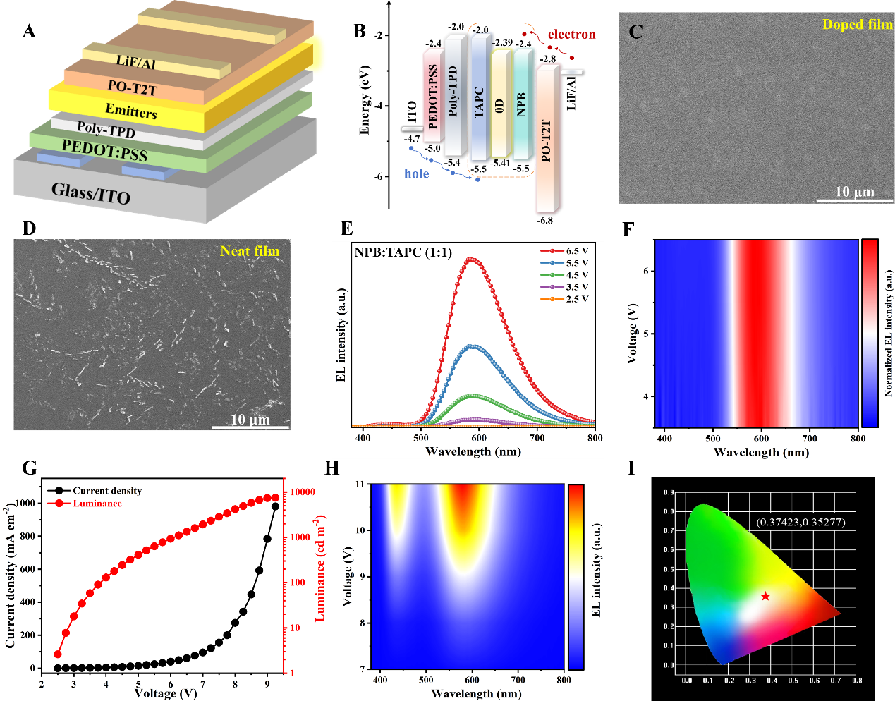 针对0D锡基卤化物“发光强但导电弱”的固有难题,袁方龙教授课题组创新性地提出了一种“主客体发光层设计策略”,巧妙地将高效发光单元与优良载流子传输框架相结合,有效推动了高性能0D锡基卤化物LED器件的实现。在该策略中,将具有优异发光性能的0D锡基卤化物“嵌入”到载流子传输与注入性能突出的主体材料中,显著提升了器件中载流子注入与迁移效率。同时,该设计优化了载流子复合过程的平衡,并改善了发光层薄膜的形貌与均匀性。得益于这一设计,所构筑的LED器件展现出超过7000 cd m-2的高亮度输出,较以往报道提升了一个数量级。进一步地,通过调控器件结构,实现了白光发射的0D锡基卤化物LED器件,其色度坐标为(0.37, 0.35),接近自然白光。该研究不仅突破了0D锡基卤化物在电致发光应用中的关键技术瓶颈,也为高性能非铅金属卤化物LED器件的开发提供了全新的设计思路和实现路径。