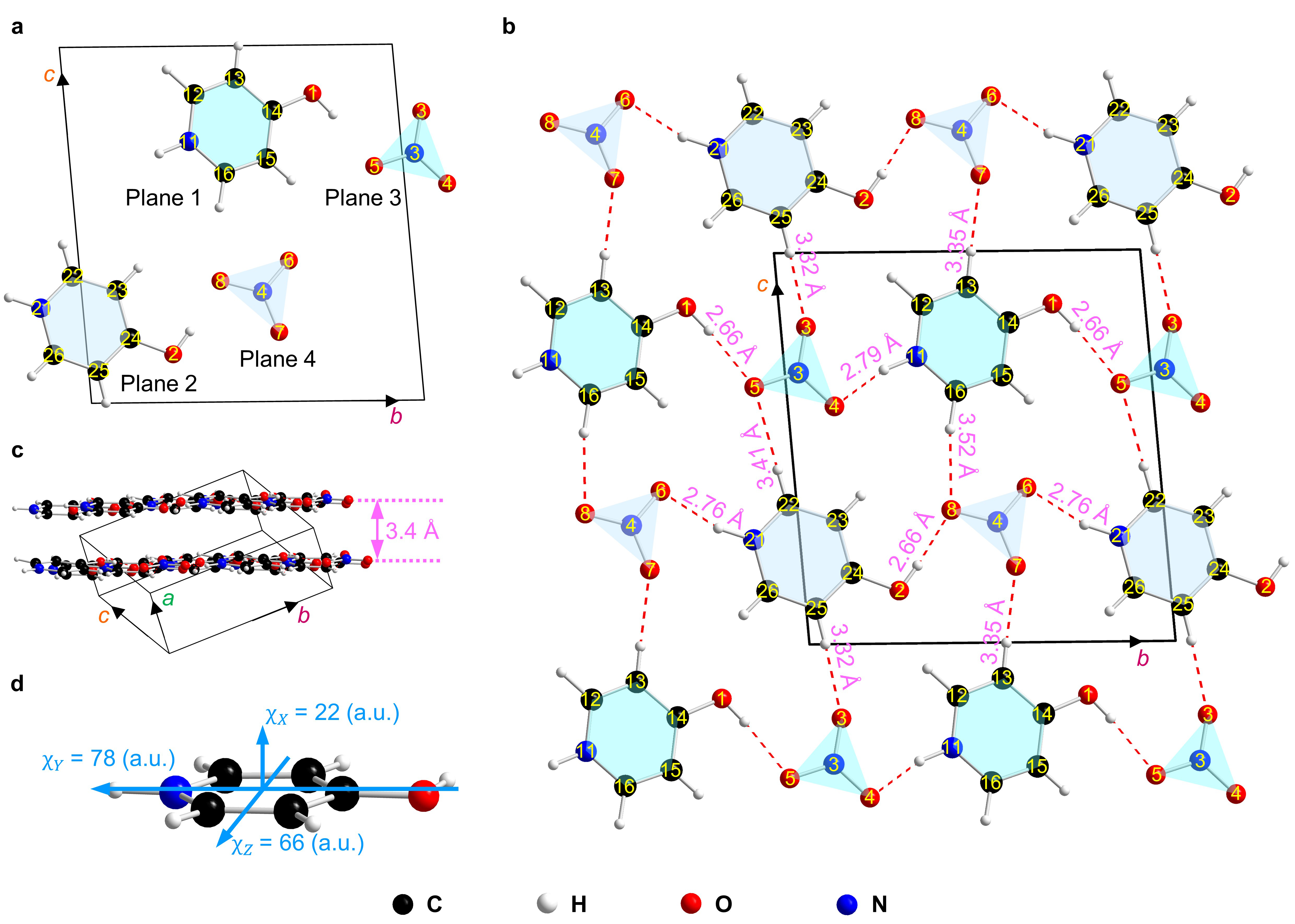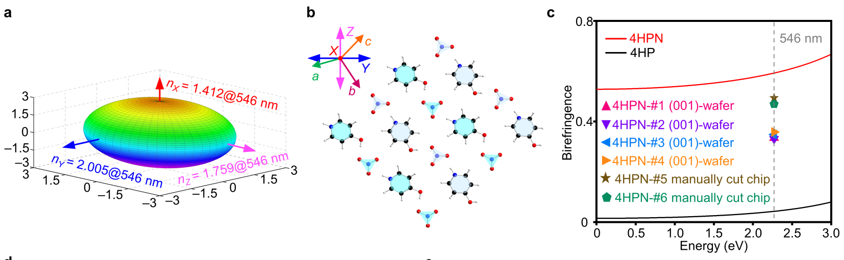 基于以上思考,近期陈玲吴立明课题组提出:选取具有平面几何构型的氢键给体和氢键受体作为构筑单元,利用给受体之间氢键相互作用,形成氢键网络(这一过程可形象地称为氢键的“类点击反应”)。由于氢键网络对平面构筑单元的束缚作用达到共面性。(如上图b所示:plane 1被4个氢键束缚;同时plane 3被3个氢键束缚,因此这两类平面型构筑单元形成了2D层状结构,上图c)这一设想为后续设计合成大双折射材料提供了新思路。基于上述思想他们设计合成了4-羟基吡啶硝酸盐((C5H6ON)+(NO3)–, 4HPN),该化合物表现了大双折射率,是含有相同阴离子或阳离子化合物中的最大值。