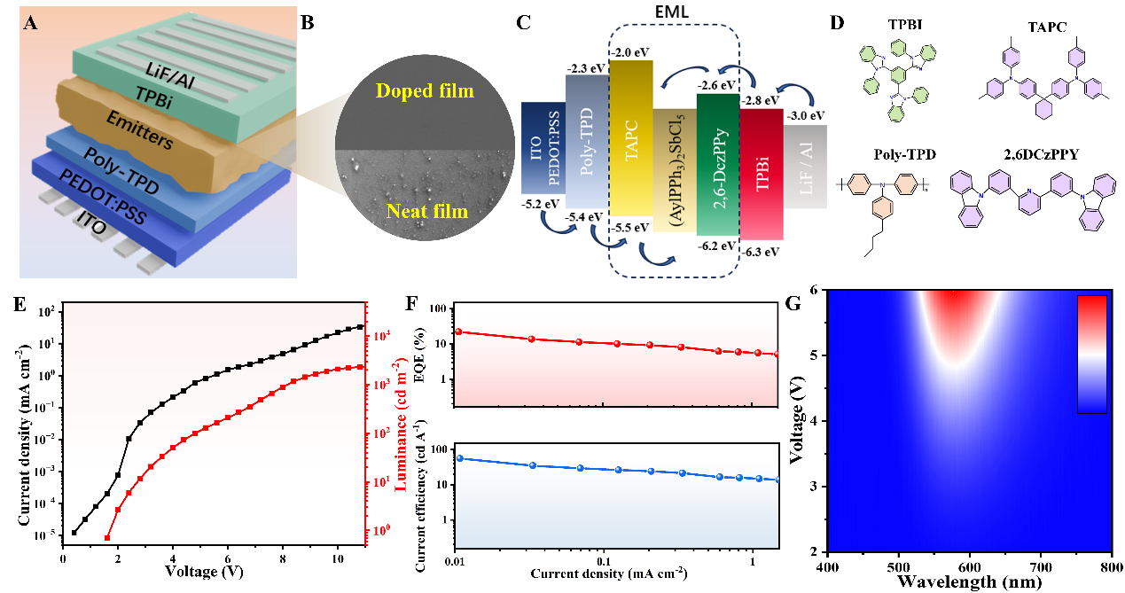 近年来,金属卤化物材料凭借其优异的光电性能,已成为新一代光电子器件(如太阳能电池和发光二极管)研究的热点。其中,铅基卤化物材料在器件性能方面表现尤为突出,但其潜在的重金属毒性严重制约了未来的实际应用与产业化发展。相比之下,锑基卤化物材料具有环境友好、化学稳定性好以及优异发光效率等优势,被认为是替代铅基体系的理想候选材料之一。然而,锑基卤化物材料本征导电性较低,载流子注入与传输效率受限,导致其在电驱动LED器件中的性能仍然较差。因此,如何有效提升载流子注入与复合效率,成为制约锑基卤化物LED器件性能提升的关键科学与技术挑战。
