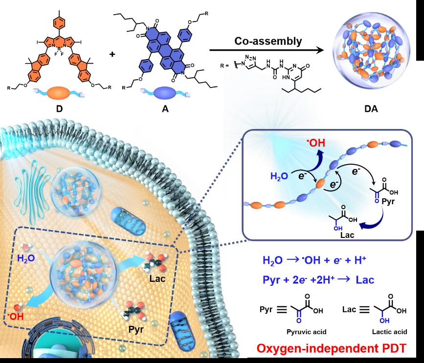 在国家自然科学基金委的支持下,北京师范大学杨清正教授、牛丽亚副教授课题组发展了可通过光氧化水产生羟基自由基(•OH)的完全不依赖氧气的超分子光动力治疗敏化剂。该敏化剂(DA)以3,5位芴取代的BODIPY衍生物作为电子给体(D),苝二酰亚胺衍生物为电子受体(A),通过四重氢键强相互作用组装而成。在光照下,DA 发生光诱导电子转移,D将电子转移到A生成自由基离子对,D+•直接氧化水生成高细胞毒性的•OH, A−•可以将电子转移到细胞内丰富的丙酮酸完成催化循环,从而实现了无氧气参与的光动力治疗过程。