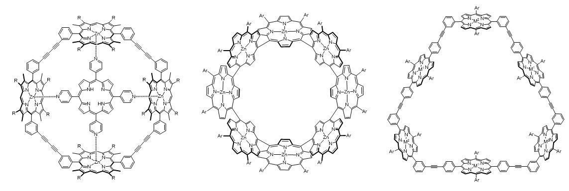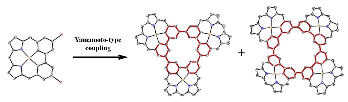 最近,北京师范大学柯贤胜课题组首次报道了两个基于碳杂卟啉的共价环状阵列(图2)。碳杂卟啉是卟啉的一个或多个吡咯氮原子被碳原子取代后的衍生物,可以根据非吡咯单元的不同,呈现出芳香性,反芳香或者非芳香性。本文以非芳香的联苯碳杂卟啉为单体,巧妙地引入二溴取代,然后通过一锅法Yamamoto偶联,经过GPC分离和重结晶,可以14%和4%的收率分别得到共价环状三聚体和四聚体。这两个新颖的环状卟啉阵列,均含有一个环间苯撑(CMP)的内核,因此构筑了卟啉化学和环状联苯化学之间的新桥梁,有可能作为一类新的大环主体化合物。