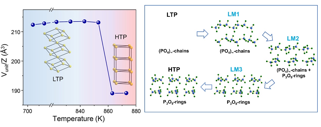 研究团队通过综合运用单晶、粉末X射线衍射、热分析、微结构分析等先进表征手段,首次揭示了KZn(PO3)3材料中温度诱导的独特拓扑相变机制。研究发现,该材料在升温过程中发生独特的结构重构:低温相中原先无限延伸的(PO4)∞链结构,在热能驱动下,解离并重组为孤立的P3O9环状结构。这一结构演变通过双重协同效应,驱动了显著的体积收缩:(1)钾离子(K+)间距的显著缩短,(2)共价键网络重组引发的晶格密堆积优化。值得注意的是,该相变过程表现可逆性,且高温相在897 K熔点下保持稳定,展现出优异的工程应用潜力。