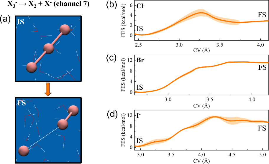 图6. X3-在水气界面反应生成X2的代表性快照 (a) 和自由能剖面图 (c, d, e)。