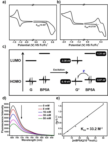 图3. a, b)化合物G和BP5A的循环伏安图;c)化合物G和BP5A的HOMO能级和LUMO能级示意图。