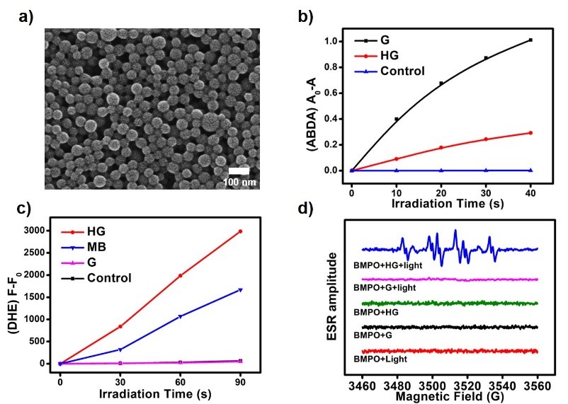 图2. a)超分子光敏剂的SEM图像;b) ABDA的吸收变化曲线;c) DHE的荧光变化曲线;d) 以BMPO为超氧捕获剂通过ESR检测超氧阴离子自由基。