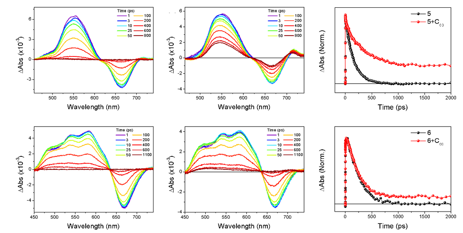 飞秒瞬态吸收光谱的研究表明在分子镊子与C60的主客体络合物中,分子镊子和C60之间存在亚皮秒级的超快电荷分离。这一现象归因于分子镊子的二吡咯甲烷和BODIPY单元的电荷密度可以离域到外围的六苯并蔻上,同时电荷通过六苯并蔻与C60之间的π-π相互作用由六苯并蔻表面高效地转移到C60上。