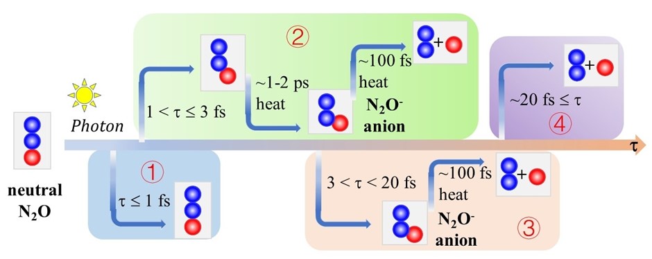 图2. 不同N2O-共振寿命下NNO 和N-O/ N≡N键长演化(左图)和 = 2 fs的几个代表性几何结构演化。