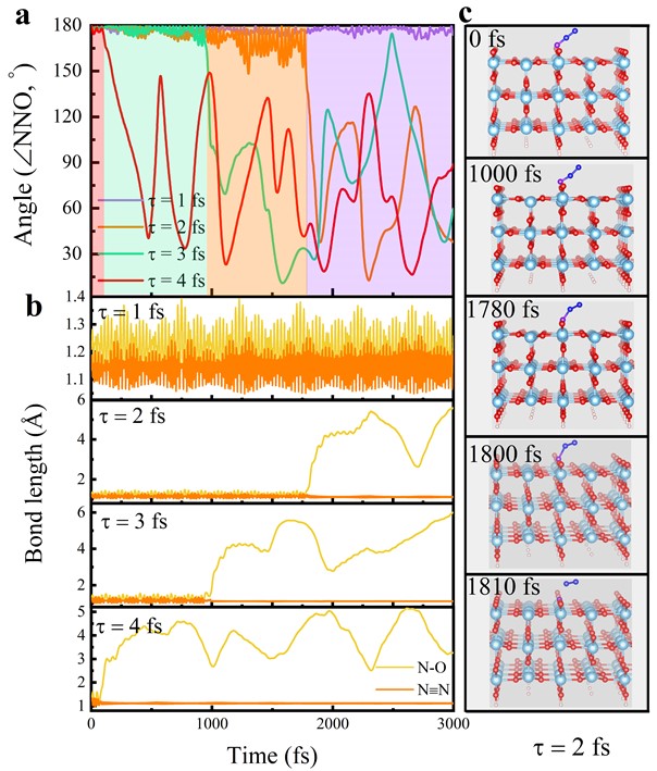 如图2所示,共振寿命决定了解离的N2O难易程度和解离机制。这里仅以氧端连接在TiO2(110)表面的模型进行讨论,氮端连接体系的讨论请见原文。随着N2O-共振寿命的增加(1-4 fs),N2O弯曲振动模式和N-O对称伸缩振动模式被逐渐被激活,使得NNO从~180逐渐降到~150,N-O逐渐拉长,直至断裂。N2O解离的时间从 = 2 fs时的~1800 fs缩短至 = 4 fs时的~70 fs,而 = 1 fs,光子和热能给予的动量还不能克服N-O解离能垒,因此分子的键长和键角在各自平衡位置发生周期性振荡。=2fs时从头算分子动力学(AIMD)的几个代表性结构也证实了N2O弯曲振动模式和N-O对称伸缩振动模式被逐渐活化。