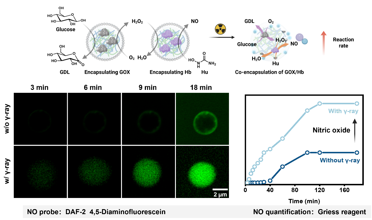 本课题中凝聚体外面裹着一层用 “自降解聚合物”(SIP)做的 “保护膜”。正常条件下这层膜异常稳定:不管是遇到浓度超高的盐(相当于海水盐度好几倍)、酸碱性波动(从偏酸到偏碱都不怕),还是被细胞培养液稀释 30 倍,它都能保持稳定。只要用临床治疗常用的射线照一下,“保护膜”就会像多米诺骨牌一样破碎。膜的破碎使得凝聚体恢复原有的流动性、融合性,进而让封装在不同凝聚体中的酶“相遇”。辐照前:两种酶远距离合作-催化速率较慢;辐照后:两种酶近距离合作-催化速率较快,实现了放疗精准调控生物催化效果。