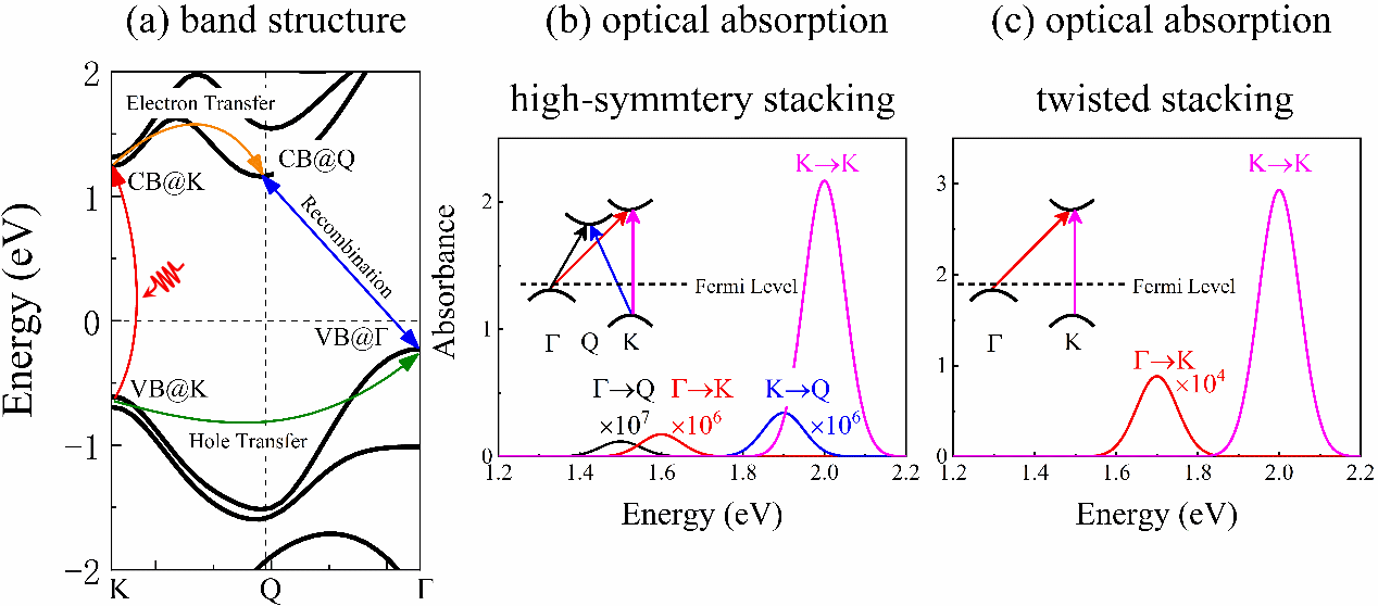 图1. (a)高对称堆垛的双层WS2的能带结构,(b)高对称结构和(c)扭转构型的吸收谱。