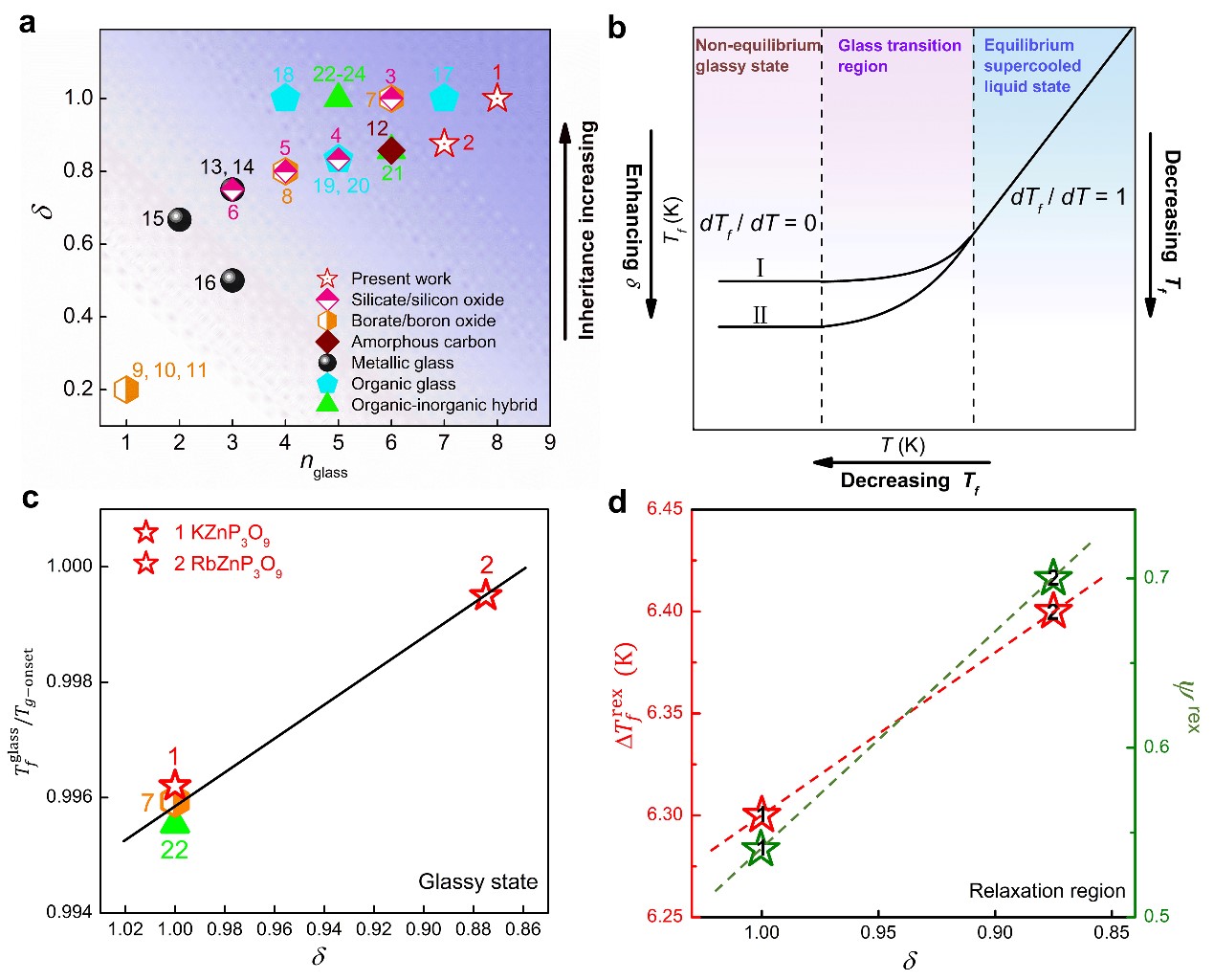 吴立明教授和陈玲教授与燕山大学王利民教授合作,通过熔融淬火的方法,利用六方KZnP3O9以及正交RbZnP3O9晶体,分别制备了新颖的AZnP3O9玻璃(A = K, Rb)。这两例罕见的晶体-玻璃对,由于化学组成相同,因此,AZnP3O9玻璃的短程序结构研究得以深入。拉曼、核磁以及对关联函数(PDF)研究证实了AZnP3O9晶体-玻璃之间存在不同程度的短程序(5Å范围内)相似性。他们定义了新参数:d = nglass/ncry(n为PDF峰数目)。利用该参数,定量鉴别了玻璃从晶体结构上获得的短程序结构继承度。他们还发现该d参数具有一定的普适性,能定量描述其他24种见诸报道的玻璃体系,如硅酸盐玻璃、硼酸盐玻璃、金属玻璃、有机玻璃以及有机无机杂化玻璃等。其中KZnP3O9玻璃的d值和PDF峰数目均最大,表明该玻璃完全继承了晶体结构的5Å范围内的短程序。进一步地,他们还发现KZnP3O9玻璃相较RbZnP3O9玻璃,d值减小,一些关键的热力学参数,如:归一化玻璃态假想温度