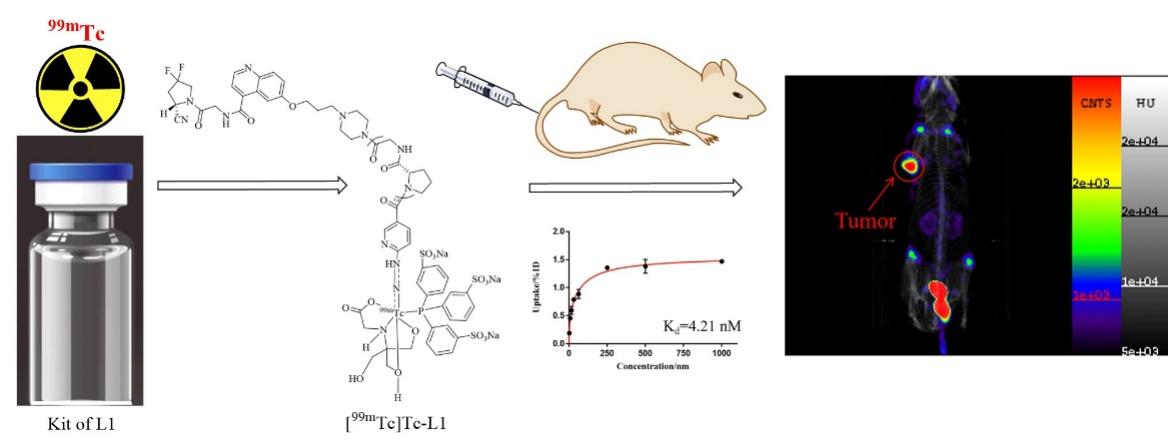 成纤维细胞激活蛋白(FAP)在大多数实体瘤基质中选择性表达于癌相关成纤维细胞(CAFs),是肿瘤诊断和治疗的潜在靶点。通过放射性核素标记成纤维细胞激活蛋白抑制剂(FAPI)及其衍生物用作肿瘤显像剂成为当前国际放射性药物研究的一大热点。99mTc是临床上应用最广的SPECT核素,理想的99mTc标记的FAPI类肿瘤显像剂还未研制成功,因此研制安全有效且质量可控的99mTc标记的FAPI肿瘤显像剂具有非常重要的现实意义。肼基尼古酰胺(HYNIC)作为一种常用双功能联接剂,其可以与三羟甲基甘氨酸(tricine)和三苯基膦三磺酸钠(TPPTS)作为协同配体来制备稳定的99mTc 标记的HYNIC配合物。连接剂(linker)连接了靶向基团和与放射性核素相连的螯合基团,对于调节放射性药物与靶点的亲和性和在生物体内的生物分布性能发挥重要作用。相关研究表明-(Pro-Gly)n-具有II型聚脯氨酸螺旋结构,可以通过调节肽链的长度来改变空间构象,从而优选出与靶点具有更高亲和力的肿瘤显像剂。基于以上考虑,张俊波教授团队设计合成了分别含有-(Pro-Gly)2-和-(Pro-Gly)6-作为连接剂的两个FAPI衍生物(L1和L2),然后和协同配体tricine/TPPTS 与99mTc 配位制备稳定的99mTc配合物([99mTc]Tc-L1和[99mTc]Tc-L2)。体外细胞研究表明[99mTc]Tc-L1显示出更高的细胞摄取和与FAP的特异性结合。U87MG肿瘤小鼠的生物分布和microSPECT/CT图像显示,[99mTc]Tc-L1与FAP具有特异性结合,其在肿瘤中摄取高且肿瘤与非靶比值好。[99mTc]Tc-L1可通过药盒化制备,安全、有效且质量可控,具有非常广阔的临床应用前景。相关研究工作以“Synthesis and Evaluation of 99mTc-Labeled FAP Inhibitors with Different Linkers for Imaging of Fibroblast Activation Proteins in Tumors”为题发表在药物化学顶级期刊Journal of Medicinal Chemistry上。bet365体育 博士生阮晴(已毕业,现北京师范大学在站博士后)、王倩娜(在读博士生)为共同第一作者,张俊波教授为通讯作者,北京师范大学为第一单位。