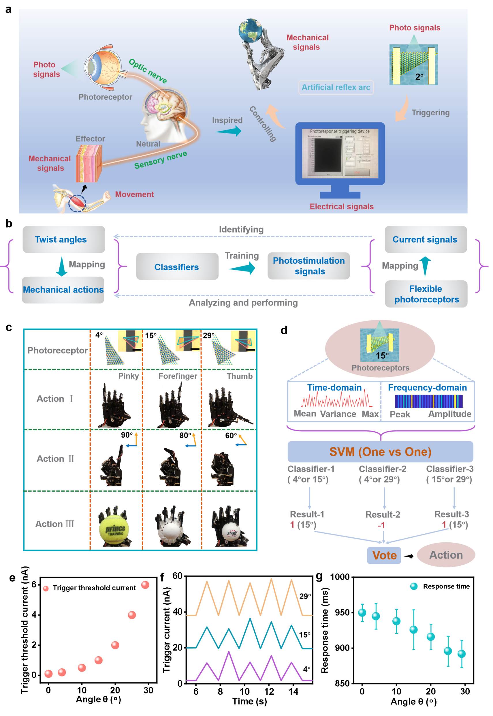 图2:基于光刺激运动的人工反射弧。 a)受生物反射弧启发的人工反射弧示意图。具有不同扭转角度的折叠双层MoS2作为光感受器的通道,结合LabVIEW、Arduino和机械手驱动器,完成信号的传输、机械手的转换和驱动。机械手的规则运动显示了光信号向机械信号的转换。b)基于光感受器、光电信号和机械动作的机器学习过程。c)柔性基板上不同扭转角度(4°、15°、29°)的光感受器,以及相应的机械动作模式(动作Ⅰ:不同手势;动作Ⅱ:食指弯曲;动作Ⅲ:机械夹持)。d)通过光触发信号产生的电流信号来识别不同扭曲角度的光感受器的机器学习。e)触发阈值电流与光感受器扭转角的函数关系。f)4°、15°及29°的光感受器随时间变化的触发电流。g)响应时间与光感受器扭转角的函数关系。