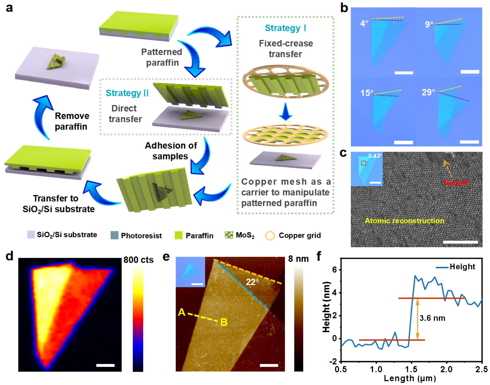 图1:石蜡辅助MoS2超晶格定制。a)图案化石蜡制备扭转双层MoS2工艺流程图。b)不同扭转角度的双层MoS2光学图像。c)扭转双层MoS2原子结构的TEM图像。插图为相应的光学图像。d)扭转双层MoS2的拉曼强度映射。e)扭转双层MoS2的AFM图像。f)比例尺虚线方向高度剖面图。