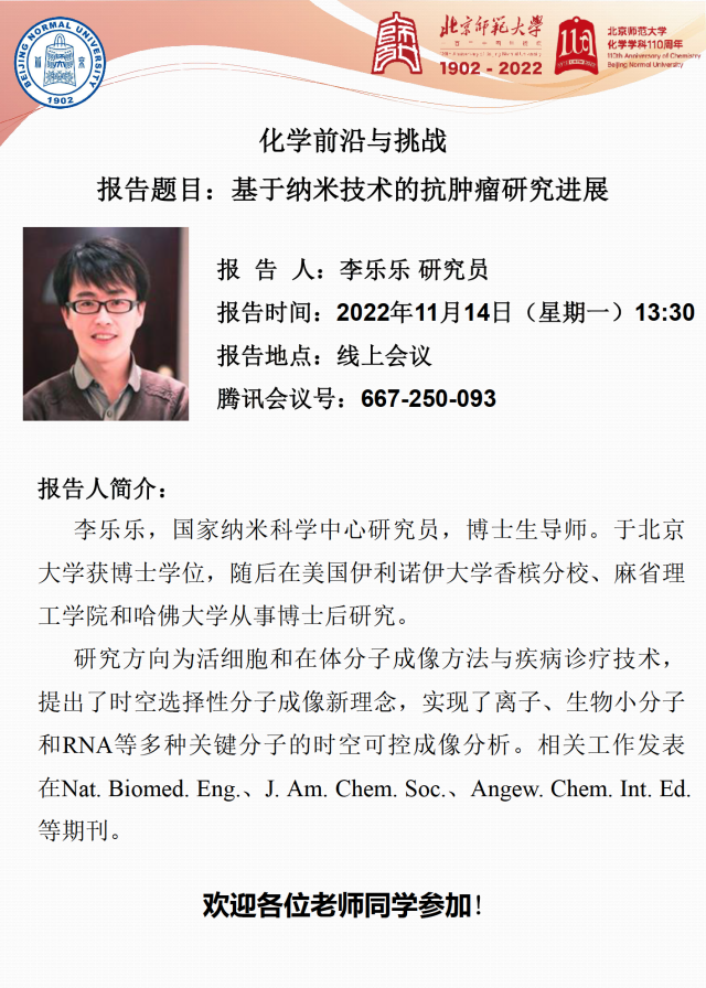 学术报告:国家纳米科学中心,李乐乐研究员,基于纳米技术的抗肿瘤研究进展