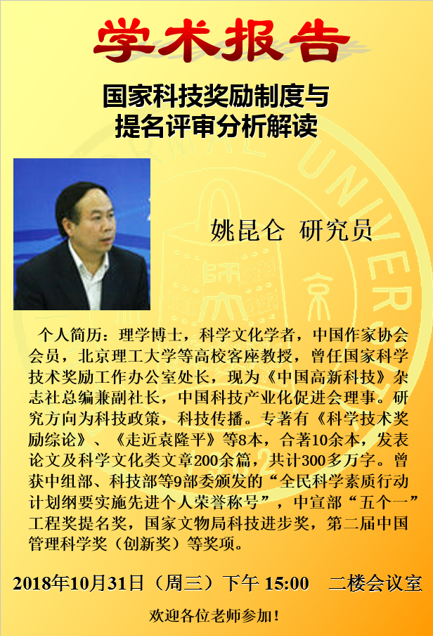 学术报告:《中国高新科技》杂志社总编兼副社长,姚昆仑研究员,国家科技奖励制度与提名评审分析解读