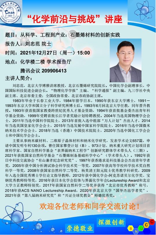 学术报告:北京石墨烯研究院,刘忠范院士,从科学、工程到产业:石墨烯材料的创新实践