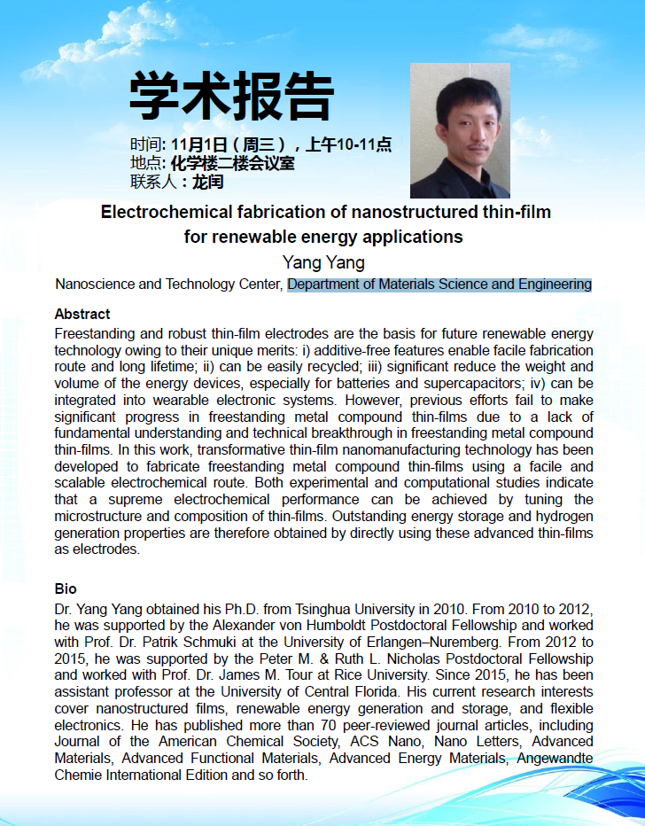 学术报告:Department of Materials Science and Engineering,Prof.Yang Yang,Electrochemical fabrication of nanostructured thin-film for renewable energy applications