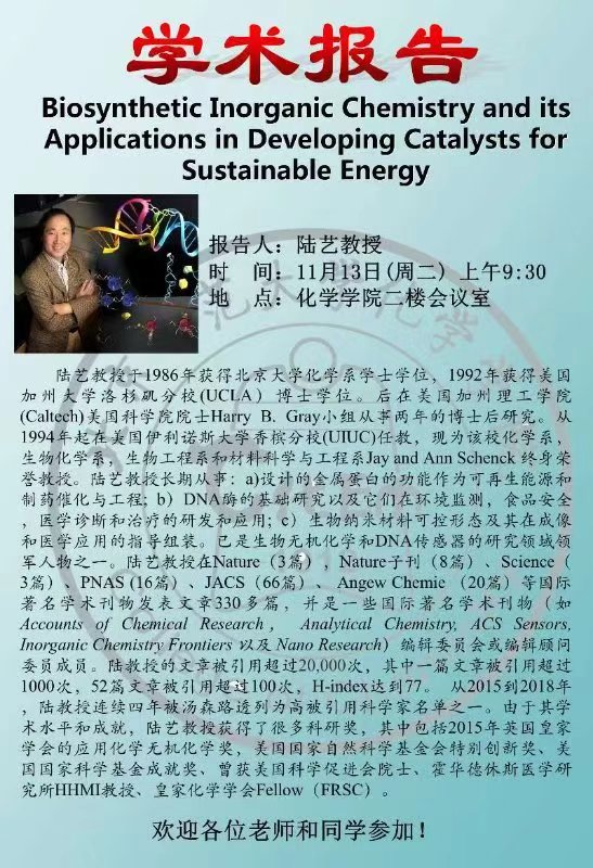 学术报告:伊利诺伊大学香槟分校,陆艺教授,Biosynthetic Inorganic Chemistry and its Applications in Developing Catalysts for Sustainable Energy