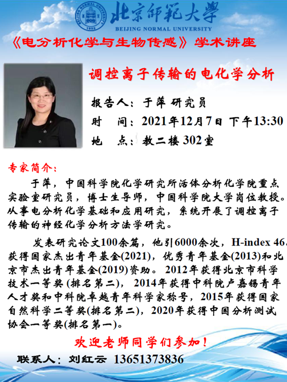 学术报告:中国科bet365体育 化学研究所,于萍 研究员,调控离子传输的电化学分析