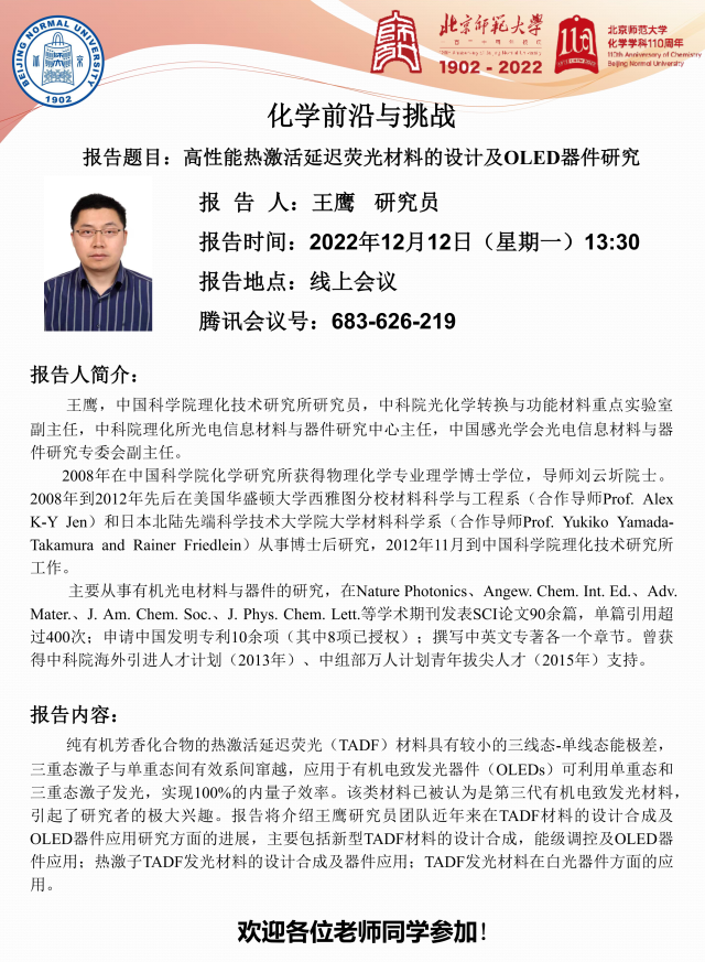 学术报告:中国科bet365体育 理化技术研究所,王鹰研究员,高性能热激活延迟荧光材料的设计及OLED器件研究