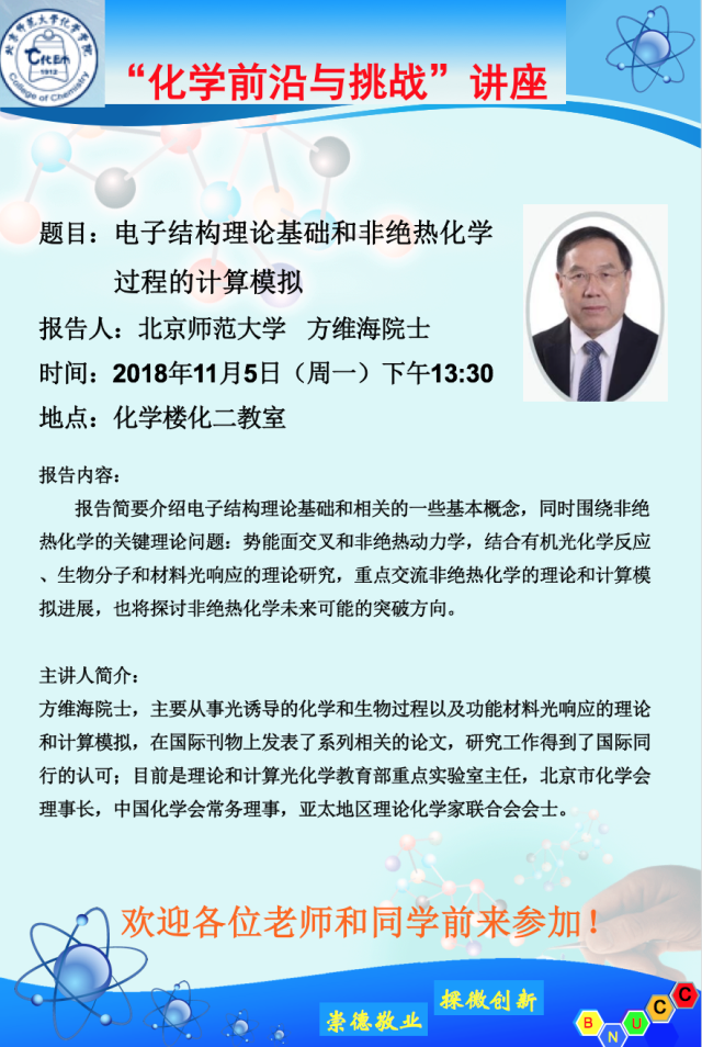 学术报告:北京师范大学,方维海院士,电子结构理论基础和反应过程的计算模拟