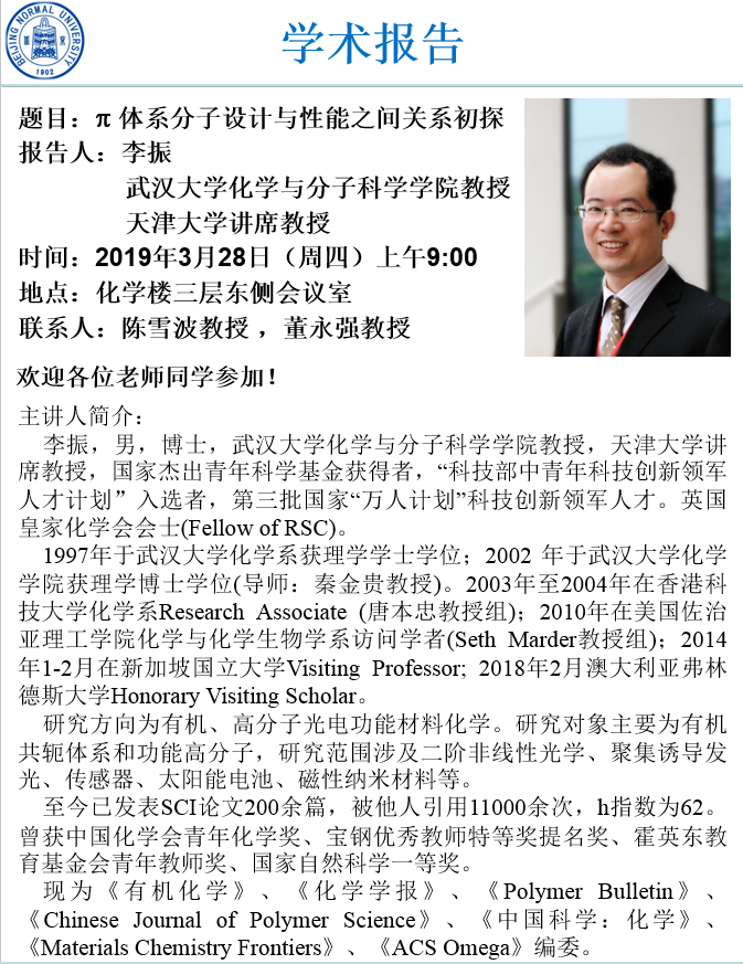 学术报告:武汉大学化学与分子科学bet365体育 ,李振教授,π体系分子设计与性能之间关系初探