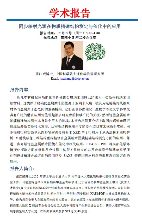 学术报告:中国科bet365体育 大连化学物理研究所,张江威博士,同步辐射光源在物质精确结构测定与催化中的应用