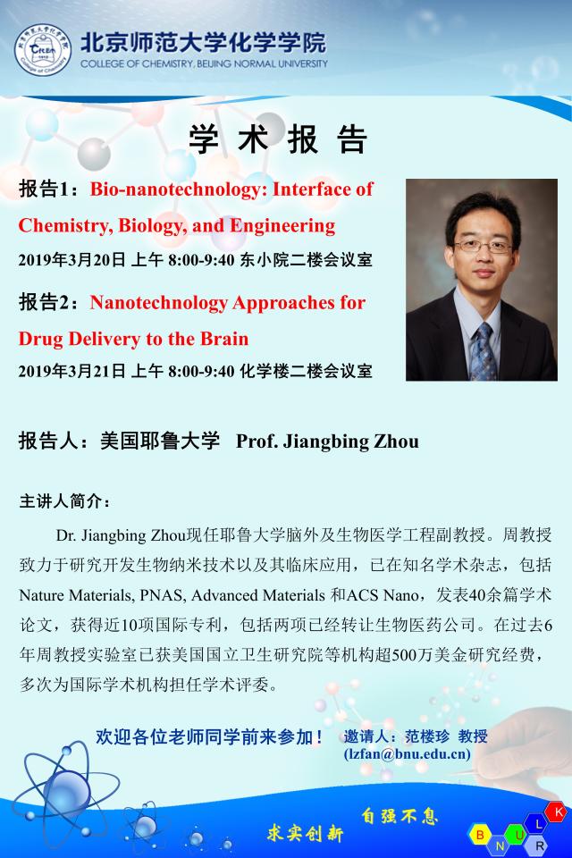 学术报告:美国耶鲁大学,Prof. Jiangbing Zhou,Bio-nanotechnology: Interface of Chemistry, Biology, and Engineering