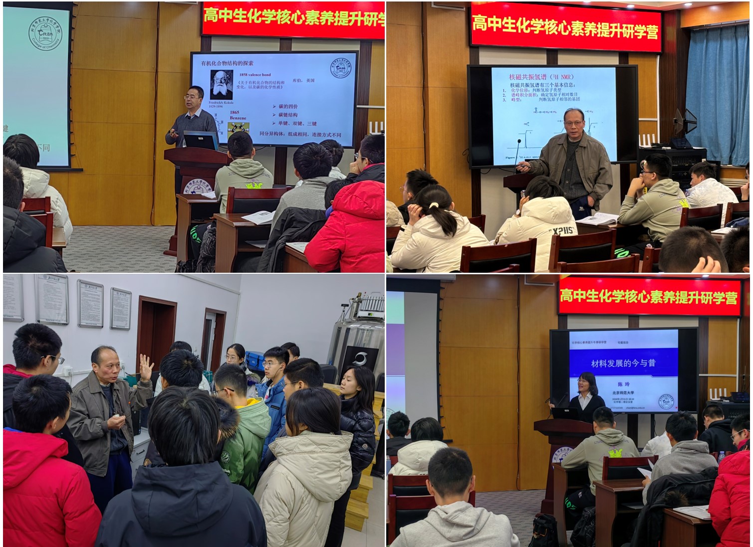 2024年1月31日下午第一阶段,卢忠林教授用风趣幽默的语言从6个方面为同学们讲授了“化学的魅力”专题报告,用大量例子展示了化学在生产生活中的重要作用,对提高同学们学习化学的兴趣有很好的引导作用。下午第二阶段,同学们学习了用核磁共振技术表征化学物质结构的原理和应用,近距离观察了核磁共振波谱仪的构造,了解了仪器操作流程等。晚上,陈玲教授结合自身学习和研究经历做了题为“材料发展的今与昔”专题报告,介绍了材料的重要性及研究流程、晶体结构和性能的关系、非线性光学晶体材料的研究实例等,使同学们更加深入地了解了材料科学。