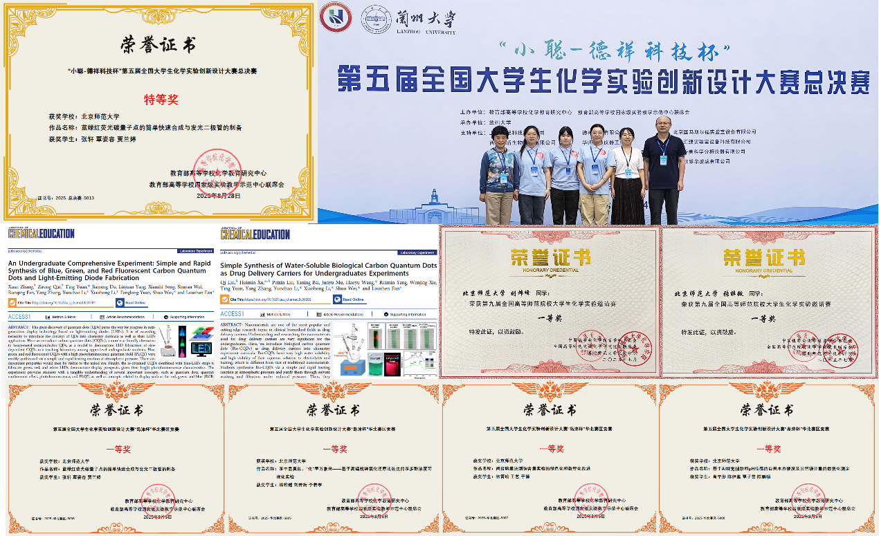 bet365体育 本科生张轩、覃姿容、贾兰婷凭借参赛作品“蓝绿红荧光量子点的简单快速合成与发光二极管的制备”,以扎实的专业基础、创新的实验设计和出色的现场表现,荣获全国总决赛特等奖(指导教师范楼珍教授和袁廷博士)。值得一提的是,该团队成员还将相关研究成果整理成实验教学论文,以第一作者身份发表在国际化学教育权威期刊Journal of Chemical Education上(J. Chem. Educ. 2025, 102, 1223-1229)。