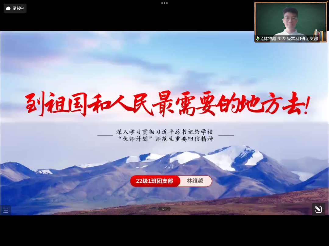 昭昭若日月之明,离离如星辰之行。21级硕士3班团支部的韩蕊浓同学以“厚植扎根基层教育报国情怀,锻造传道授业解惑过硬本领”为主题,说明教师是人类灵魂的工程师。韩蕊浓同学语速流畅自然,ppt 内容简洁明了,用直观的数字与师大人的实例解读“优师计划”,同时结合京师化学“优师计划”,展现了教育是国之大计,党之大计,师范是立教之本,兴教之源,呼吁同学们仰望星空,脚踏实地以抵达灵魂的翠草流芳之境。