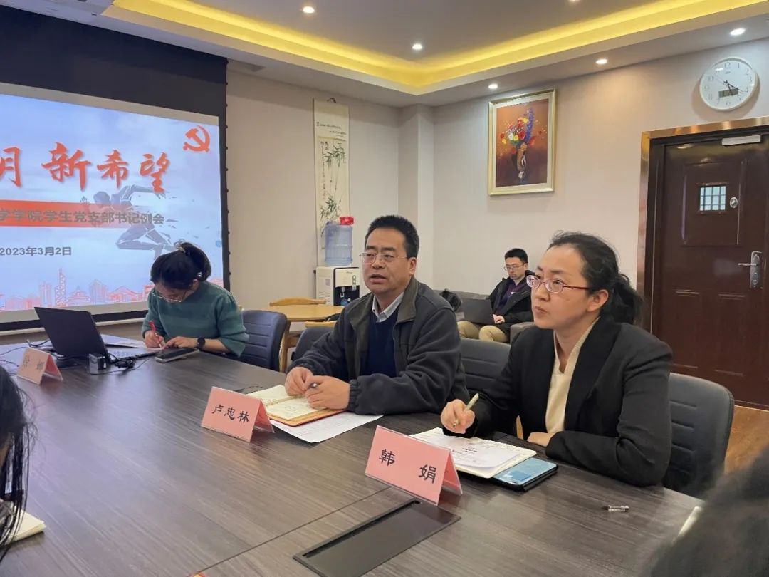 2023年3月2日下午17:00,bet365体育 2023年春季学期第一次学生党支部书记例会于化学楼314会议室召开,bet365体育 党委书记卢忠林、党委副书记韩娟、党委办公室主任徐娜、党建组织员袁昶和全体本、硕、博学生党支部书记参加会议,本次会议由bet365体育 袁昶老师主持。