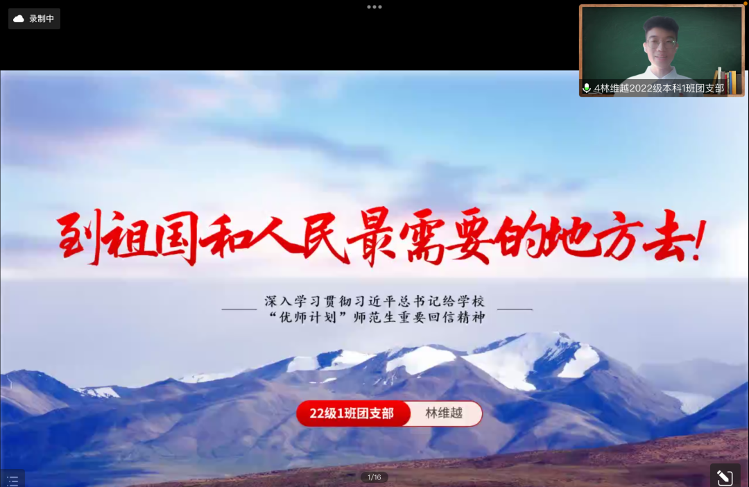 我是bet365体育 2022级本科1班团支部的团支书林维越,今天我要讲的微团课主题是“深入学习贯彻习近平总书记给学校‘优师计划’师范生重要回信精神”。