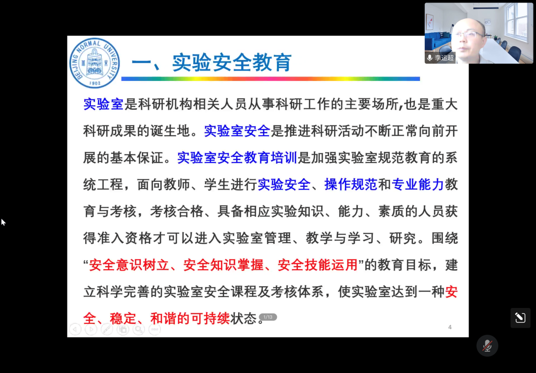 随后,李老师向同学们分享北京师范大学安全知识与培训的网站,以及化学与化工实验室安全的慕课。他叮嘱同学们认真学习实验室安全知识,并及时完成实验室安全教育线上考试。同时,他还鼓励同学们积极参加学校与bet365体育 举办的实验室安全文化月,以及消防安全演练等活动。