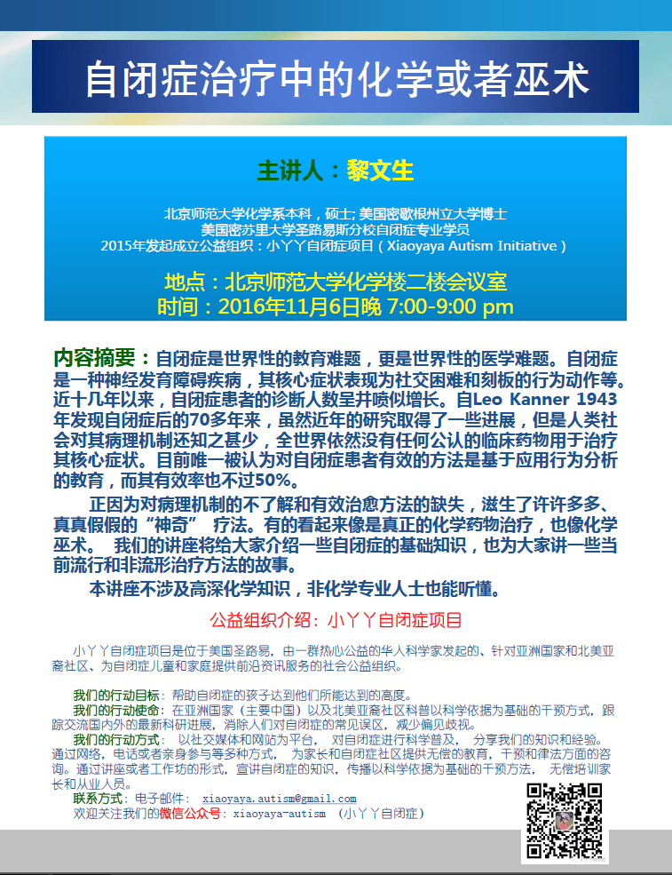 公益讲座:美国密苏里大学圣路易斯分校自闭症专业学员,黎文生博士,自闭症治疗中的化学或者巫术