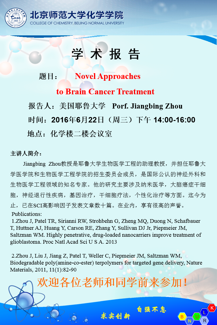 学术报告:美国耶鲁大学 Porf. Jiangbing Zhou, Novel Approaches to Brain Cancer Treatment