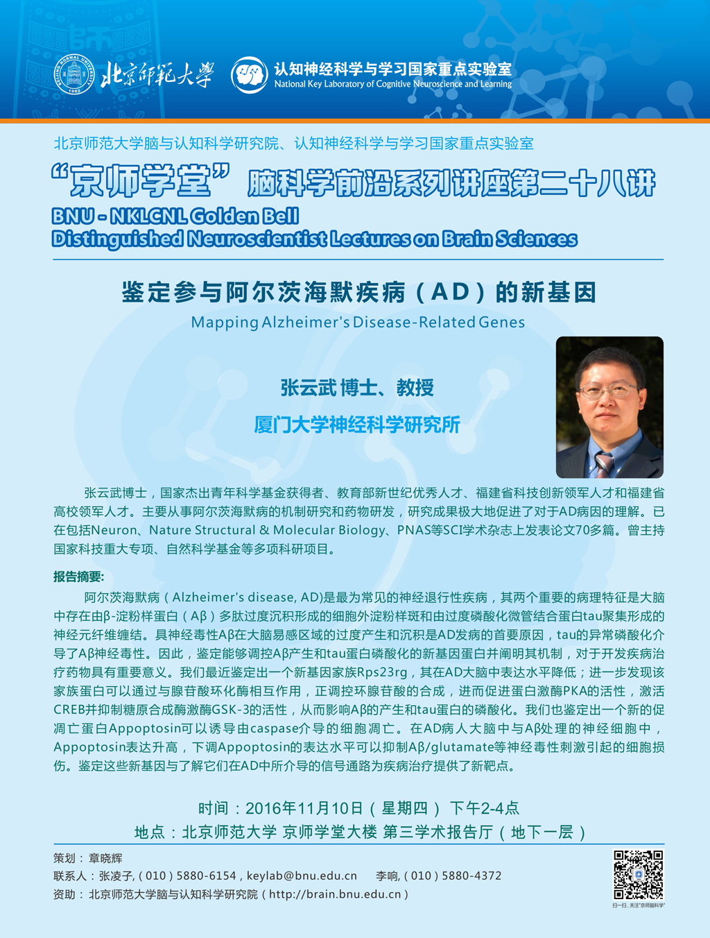 学术报告:厦门大学神经科学研究所,张云武教授,Mapping Alzheimer’s Disease-Related Genes