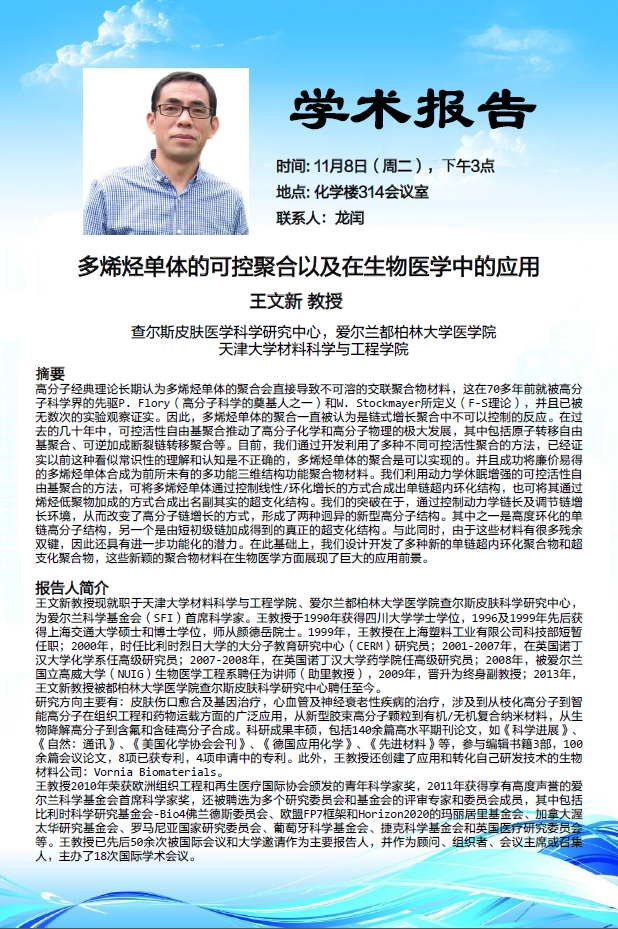 学术报告:爱尔兰查尔斯皮肤医学科学研究中心都柏林大学医bet365体育 ,王文新 教授,多烯烃单体的可控聚合以及在生物医学中的应用