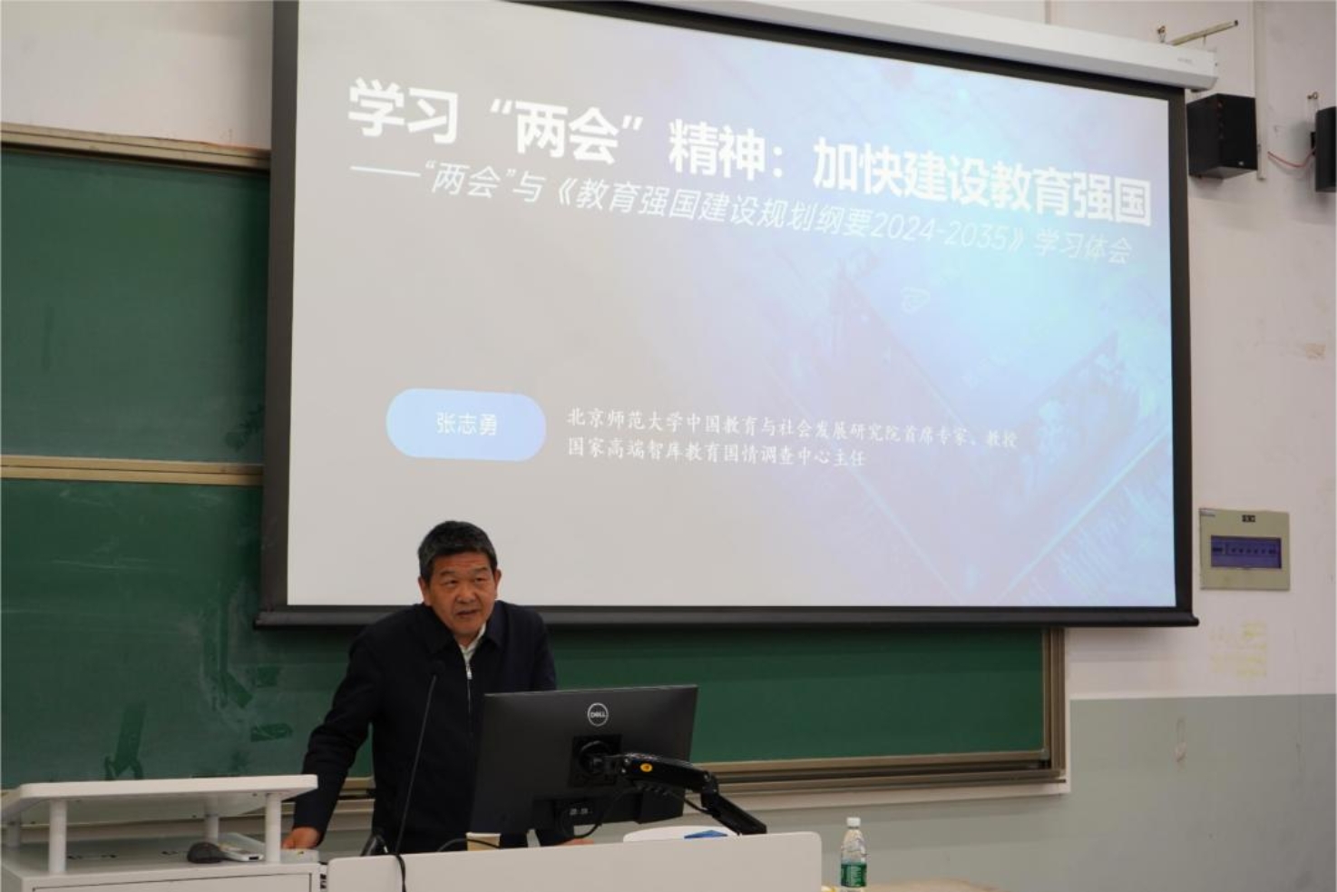 为深入学习全国两会精神,贯彻落实《教育强国建设规划纲要(2024-2035)》(以下简称《纲要》),2025年3月28日下午16:30,bet365体育 二级党校在化二教室举办全国两会精神暨《纲要》专题辅导报告会。本次活动特邀全国政协委员,北京师范大学国家高端智库教育国情调查中心主任张志勇教授,作题为“学习贯彻两会精神,推进教育强国建设”主题报告。bet365体育 党委理论学习中心组以及200余名师生党员代表参加了学习。报告会由bet365体育 党委书记杨钊主持。