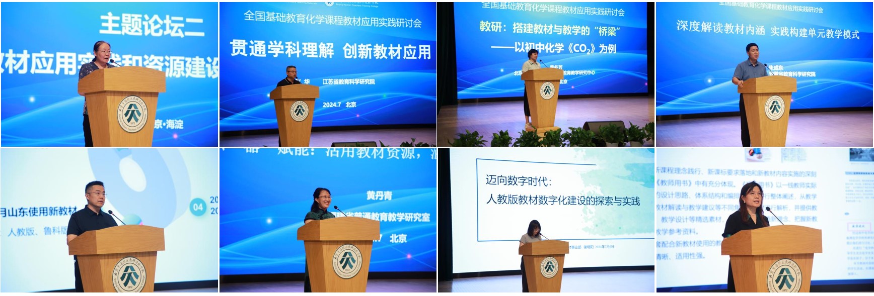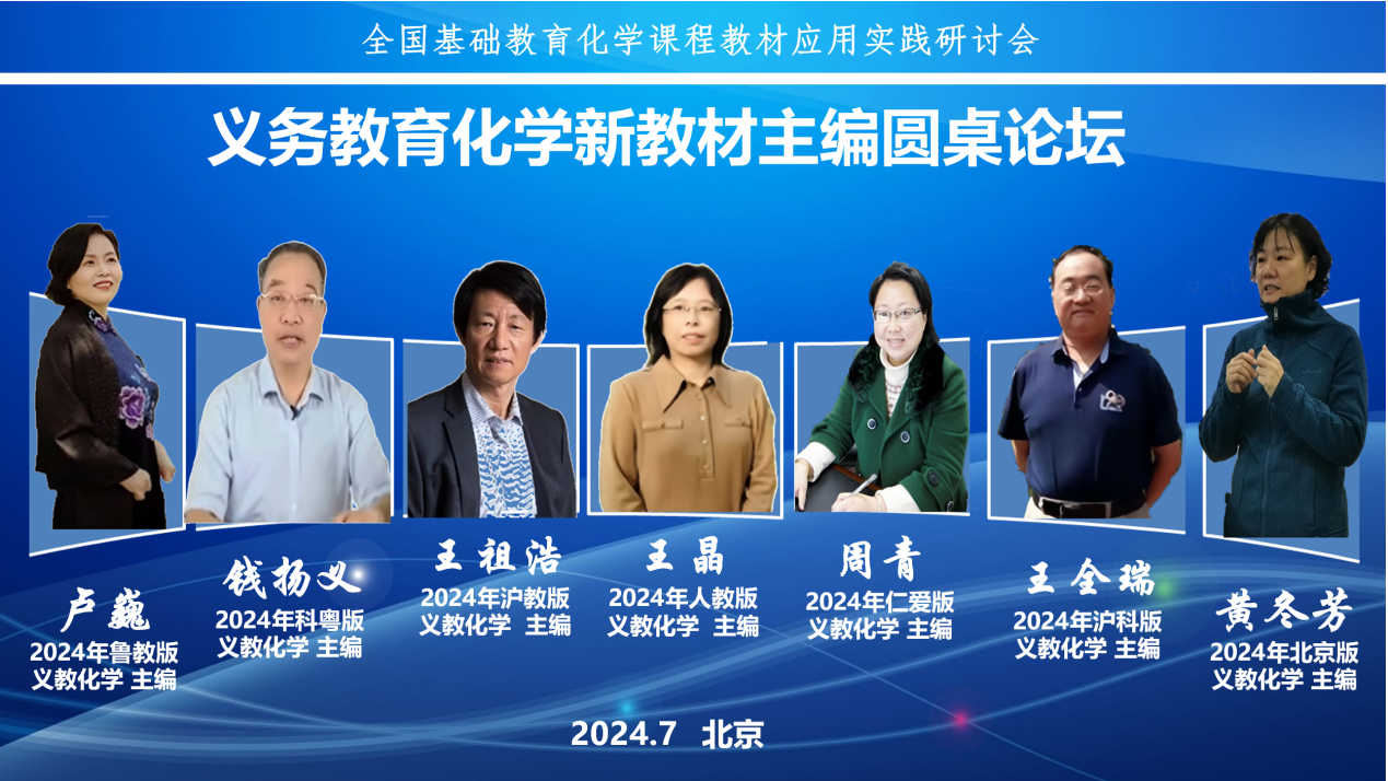 主题论坛一“义务教育化学新教材主编圆桌论坛”由中小学化学国家教材建设重点研究基地主任、北京师范大学王磊教授主持,汇集了7位义务教育化学教材(2024年版)的主编:王晶、王祖浩、周青、钱扬义、王全瑞、卢巍、黄冬芳,他们分别从新教材的修订重点和特色、编写策略和应用实践展望三个方面进行了分享。