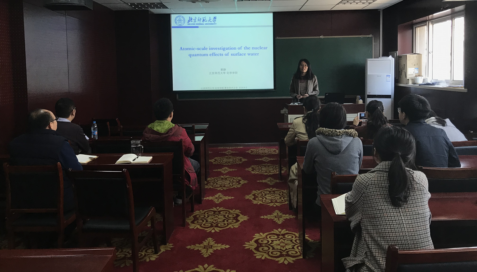 郭静教授2018年入职bet365体育-bet365亚洲官网 ,主要从事基于扫描隧道显微镜/qPlus非接触式原子力显微镜的表面物理化学研究。近年来在尖端扫描探针技术的发展、表面水/冰的亚分子级分辨成像、质子转移动力学、核量子效应(量子隧穿和量子涨落)对水的氢键网络、氢键强度甚至表面异质催化的影响等方面取得一系列优秀的研究成果。郭静老师结合自身的科研经历,做了题为“Atomic-scale investigation of the nuclear quantum effects of surface water with STM/AFM”的主题报告,报告深入浅出、内容丰富而详实,引起了相关领域研究工作者和研究生的极大兴趣。随后,郭静老师与在座师生进行了热烈的讨论并就相关问题进行了深入的交流。